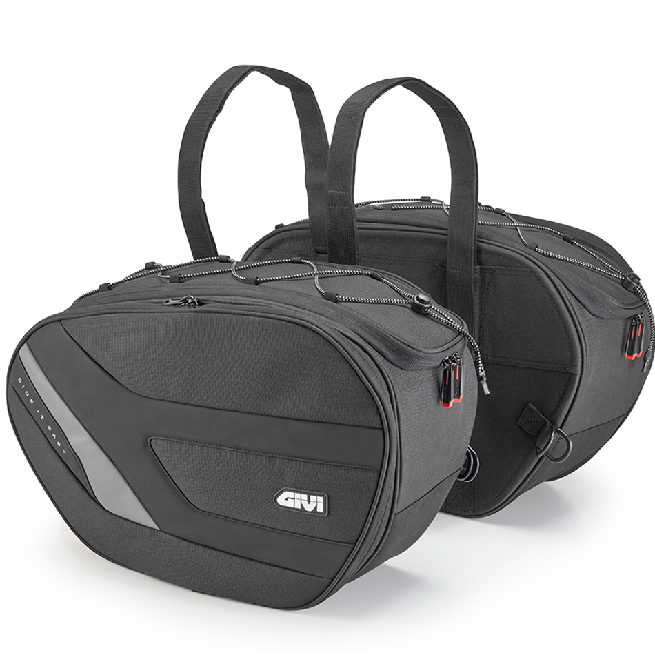 These Givi EASY11 Throw Over Expandable Motorcycle Panniers 25 Litre replace the Givi EA100, the Givi EA100B and the Givi EA100C. Each pannier can be expanded from 18 to 25 litres using the outer zip and can be fitted on to the Givi Remove X pannier rails. These reinforced sided soft panniers can be fitted securely and sturdily in to position. A pair of rain covers are included for those not so perfect days.