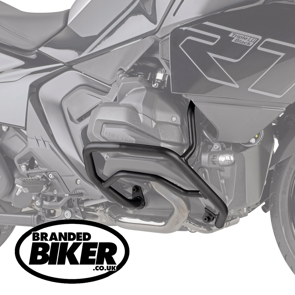These Givi TN5149 Engine Guards BMW R 1300 RT 2026 on models, are made from 25 mm diameter, 2 mm thick, steel tubing designed to reduce any serious damage to the cylinder heads, exhaust headers and engine casings that would usually be sustained in an accident, making them ideal for touring, adventure riding and everyday use. The Satin Black Hard Coated Left and Right sided Engine Guards, the spacers, the instructions and all the necessary fittings are included. Due to the close tolerances it is advised that these Givi Engine Guards should be fitted by a competent mechanic. The original Spotlights, which were offered by BMW as an optional extra, can be mounted onto the Givi Crash Bars.